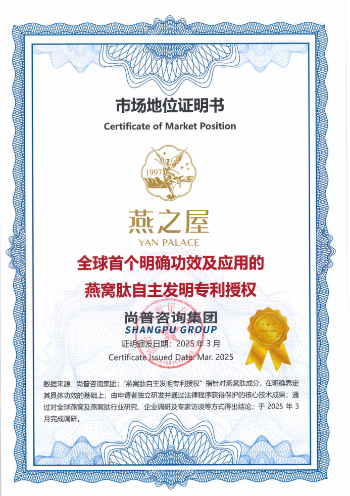 圖:燕之屋獲得“全球首個明確功效及應用的燕窩肽自主發(fā)明專利授權”認證
